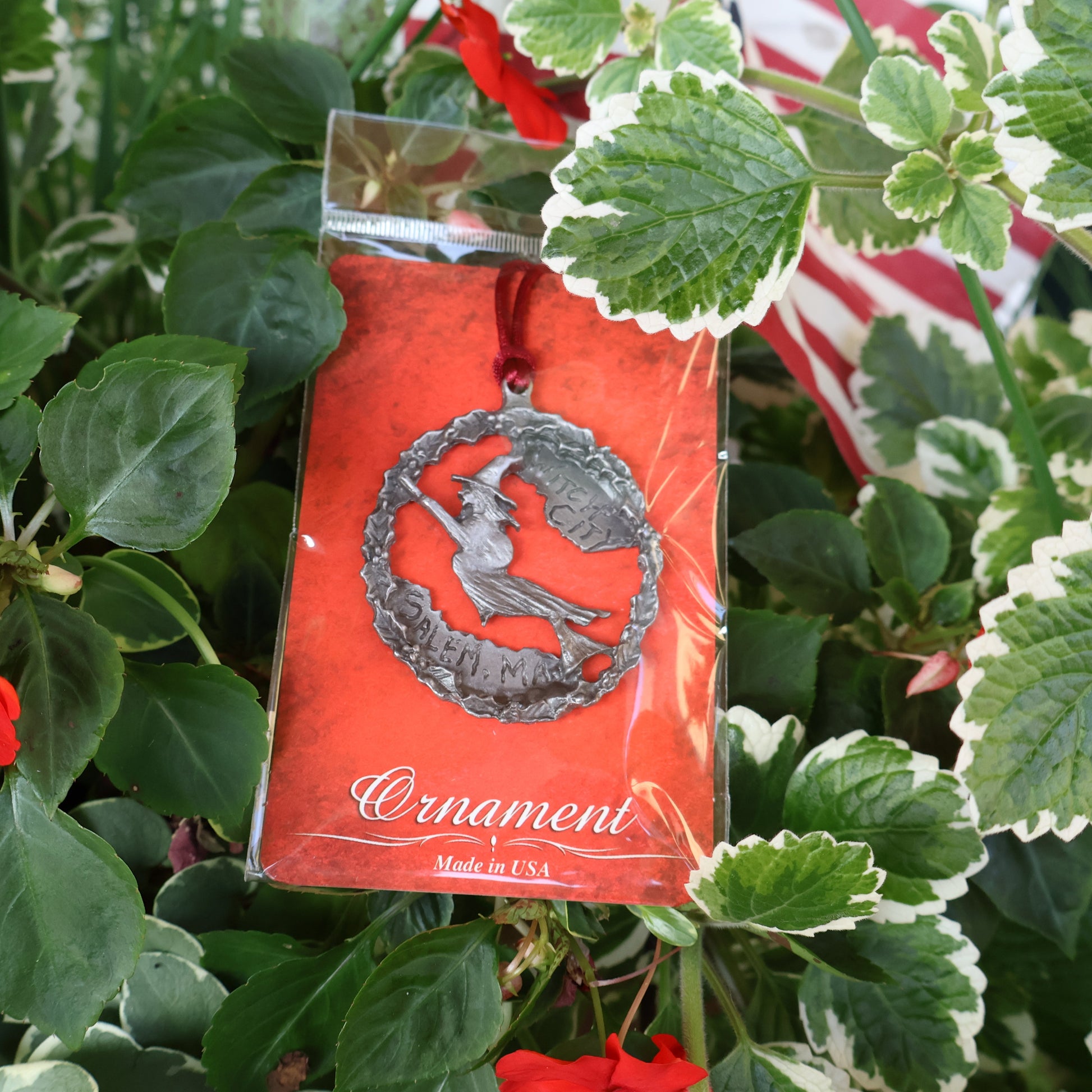 Pewter ornament is approximately 3" across. Has red satin cord for hanging. Holly wreath with a witch on broom says, "Witch City" and "Salem, Ma".