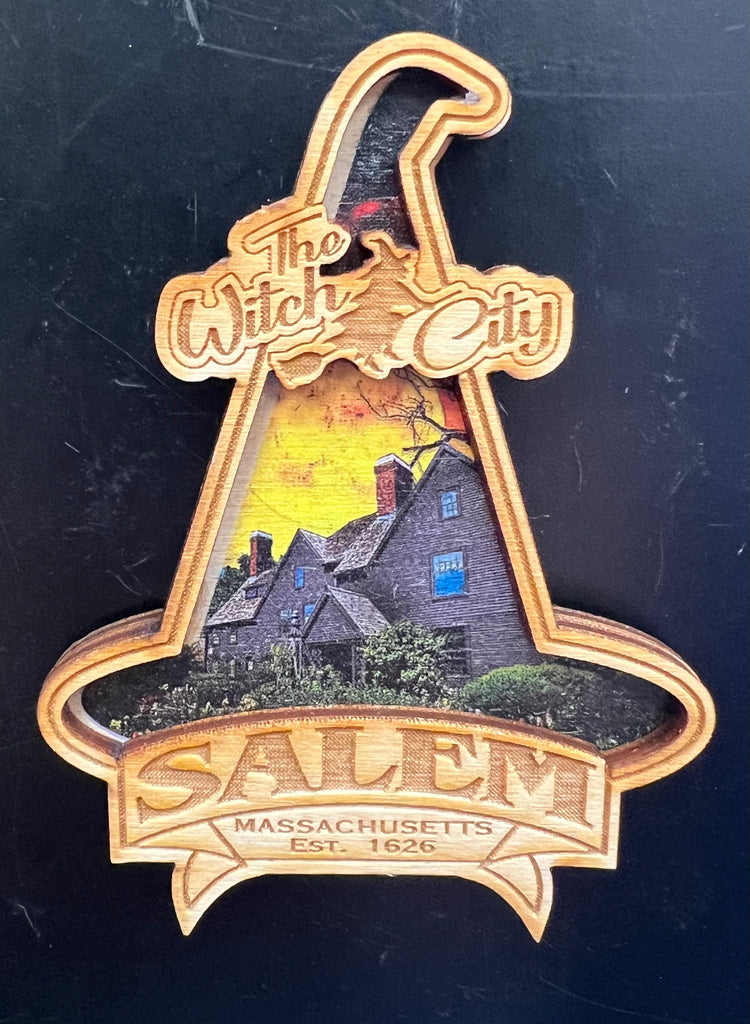 Laser cut wood magnets in two designs. Salem Witch is laser cut and stained, and measures 3" x 3.25". Witch Hat is laser cut with a full color background of the House of 7 Gables and measures 2.5" x 3.25".